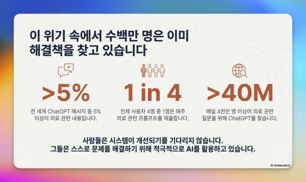 이러한 상황 속에서 많은 사람들이 예상치 못한 해결 방법을 활용하고 있다. 바로 챗GPT다. 전 세계적으로 ChatGPT에서 오가는 모든 메시지의 5% 이상이 의료 관련 내용이며 매일 4천만 명이 넘는 사람들이 Ai 에게 건강과 관련한 질문을 하고 있다.