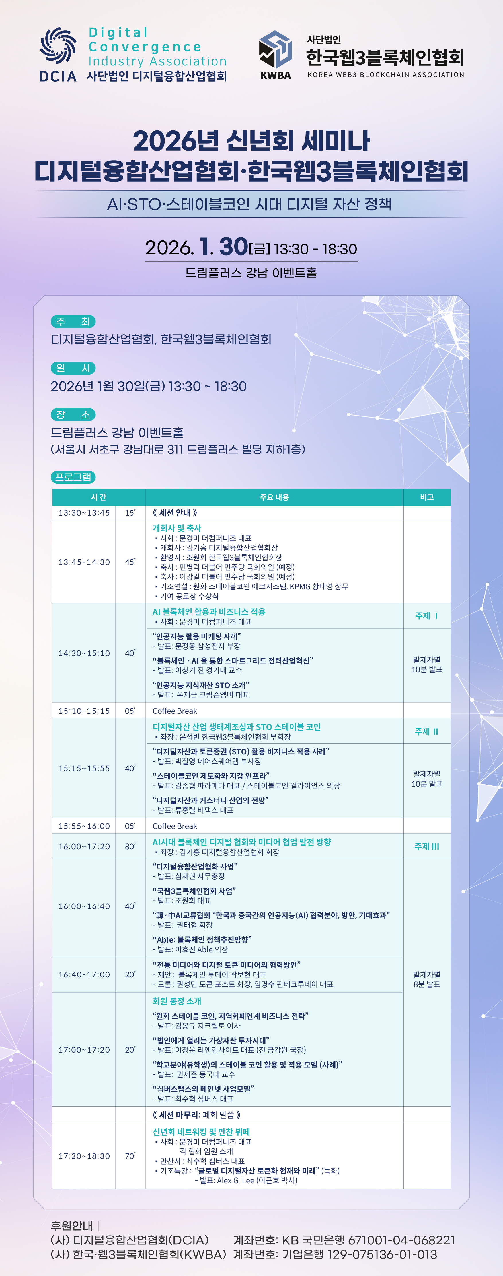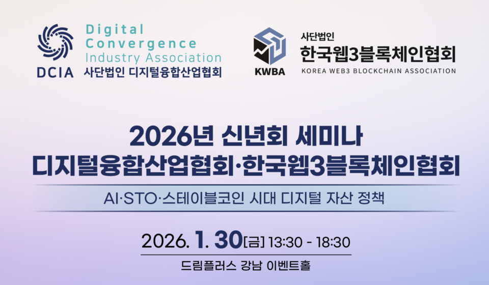 사단법인 디지털융합산업협회(회장 김기흥)는 2026년 1월 30일 오후 1시 30분 강남 드림플러스에서 '2026 디지털융합산업협회(DCIA)·한국웹3블록체인협회(KWBA) 신년회 세미나'를 개최한다고 밝혔다.