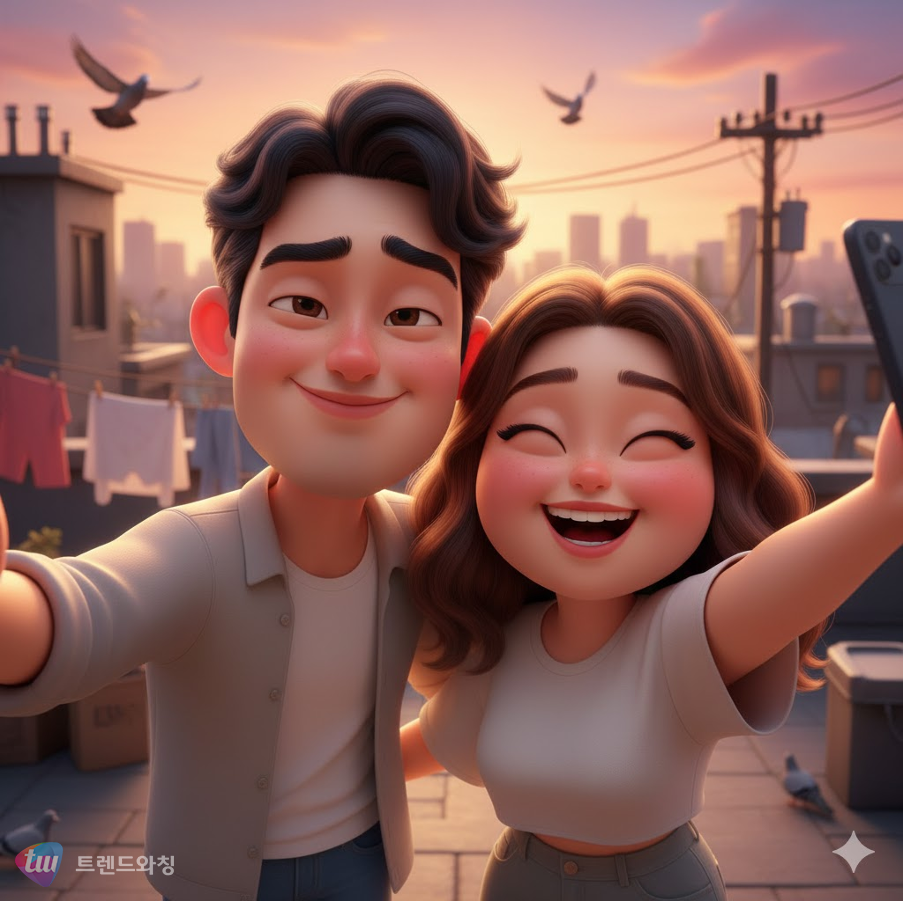 프롬프트: 울트라 HD 4K 픽사 스타일 3D 초상화 토르 토토를 생성해줘. 황금빛 시간대에 도시 옥상에서 셀카를 찍으려는 젊은 커플. 남자는 30대 초반 한국인 청년으로 부드러운 미소와 따뜻한 갈색 눈매, 짧은 웨이브진 검은 머리, 살짝 통통한 뺨과 부드러운 턱선, 촬영 도중 실수로 재채기를 하며 눈을 반쯤 감고 볼을 부풀린 채 귀엽게 당황한 표정. 여자는 30대 초반 사랑스러운 한국인 여성으로 어깨까지 오는 긴 생머리 웨이브, 크고 동그란 눈에 부드러운 미소, 부드럽고 둥근 얼굴형에 살짝 볼살 있는 포근한 인상, 웃음을 터뜨리며 몸을 뒤로 젖히고 휴대폰을 기울여 화면 밖으로 내민다. 둘은 캐주얼한 차림이다. 남자는 심플한 흰 티셔츠에 청바지와 가벼운 재킷, 여자는 오버사이즈 크롭탑에 와이드 팬츠를 입었다. 따뜻한 석양이 하늘을 주황과 분홍빛으로 물들이고 비둘기들이 날아가며 배경에는 빨래가 펄럭인다. 카메라 각도는 약간 낮고 기울어져 혼란스러운 순간을 강조하며 과장된 만화 같은 표정을 부각시킨다.