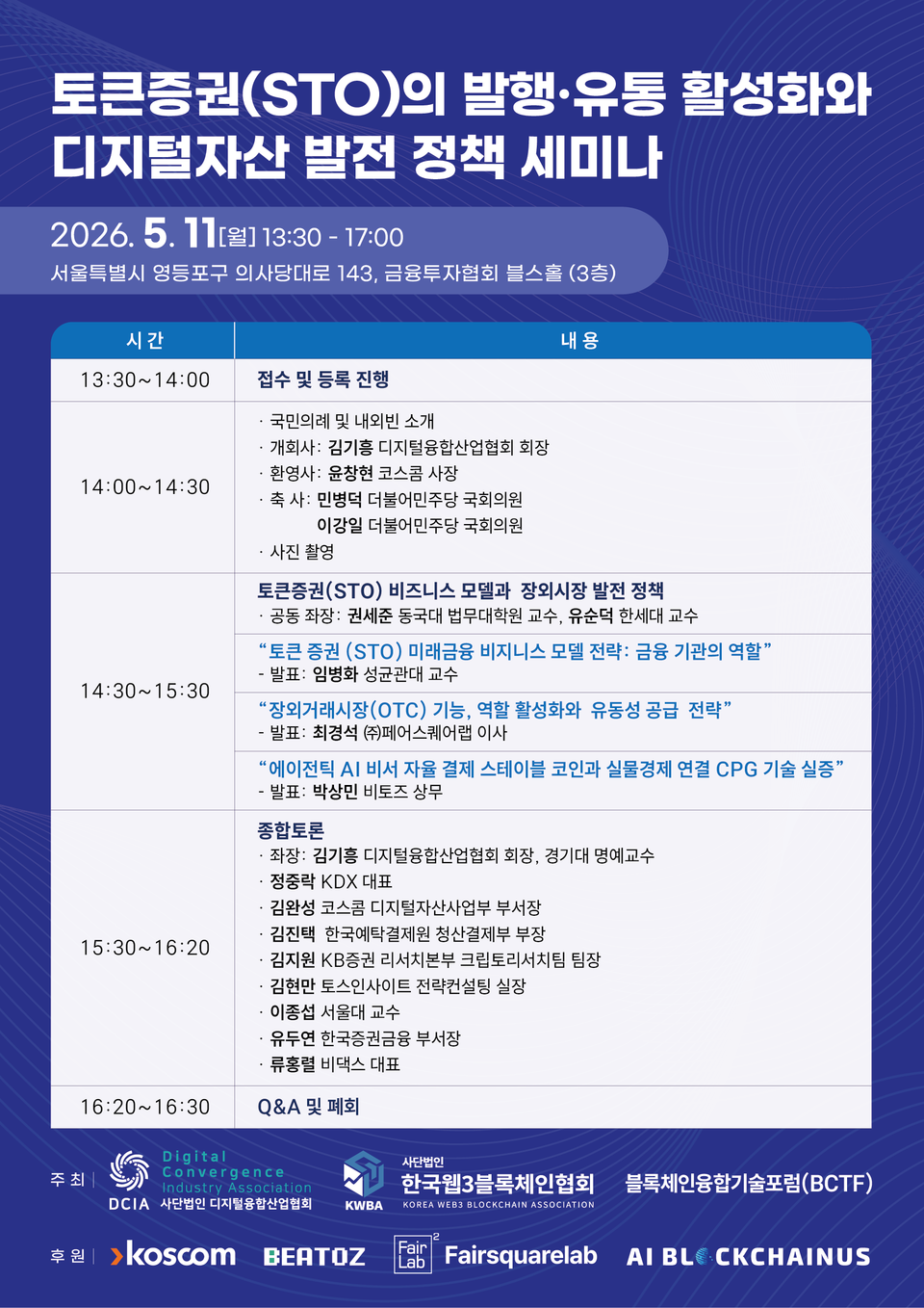 사단법인 디지털융합산업협회(회장 김기흥)는 2026년 5월 11일 오후 1시 30분, 여의도 금융투자협회 불스홀(3층)에서 ‘토큰증권(STO)의 발행·유통 활성화와 디지털자산 발전 정책 세미나’를 개최한다. 이번 행사는 디지털융합산업협회(DCIA), 한국웹3블록체인협회(KWBA), 블록체인융합기술포럼(BCTF)이 공동 주최하며, 코스콤(KOSCOM), 비토즈, 페어스퀘어랩, AI블록체인어스가 후원한다.